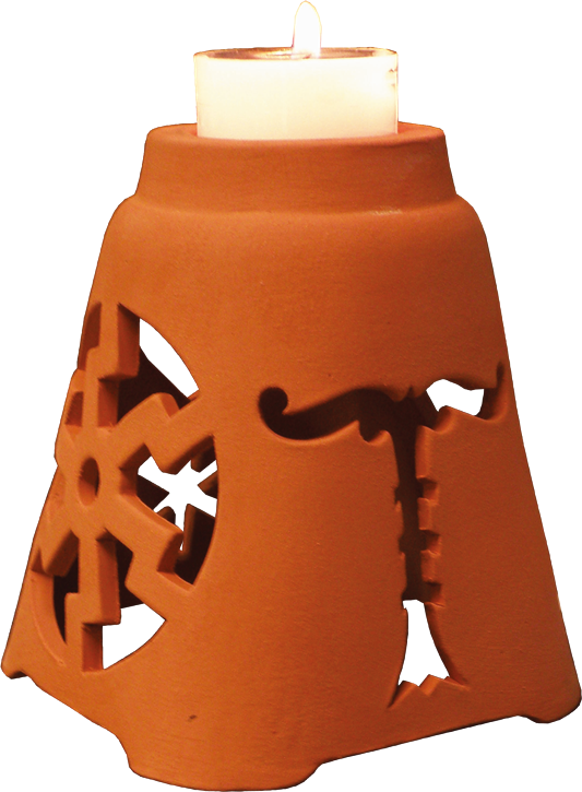 L’Irminsul, la roue solaire, un cœur, la rune de vie et une rune hagale sont incorporés sur le chandelier.